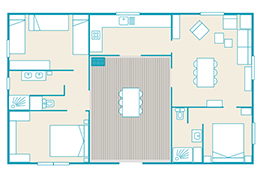 Wohnfläche 32,5 m² für bis zu 6 Personen. Schlafzimmer mit Doppelbett 160 cm x 190 cm, weiteres Zimmer mit 3 Betten 80 cm x 190 cm, Ecksofa im Wohnzimmer zum Doppelbett ausklappbar. Kochecke mit vierflammigem Gaskocher, Spüle, Dunstabzugshaube, Geschirrspülmaschine, Kühlschrank mit Gefrierfach, Mikrowelle, Kaffeemaschine. Dusche mit Waschbecken, getrenntes WC. Teilweise überdachte Terrasse (12,5 m²) mit Gartenmöbeln, zwei Sonnenliegen.